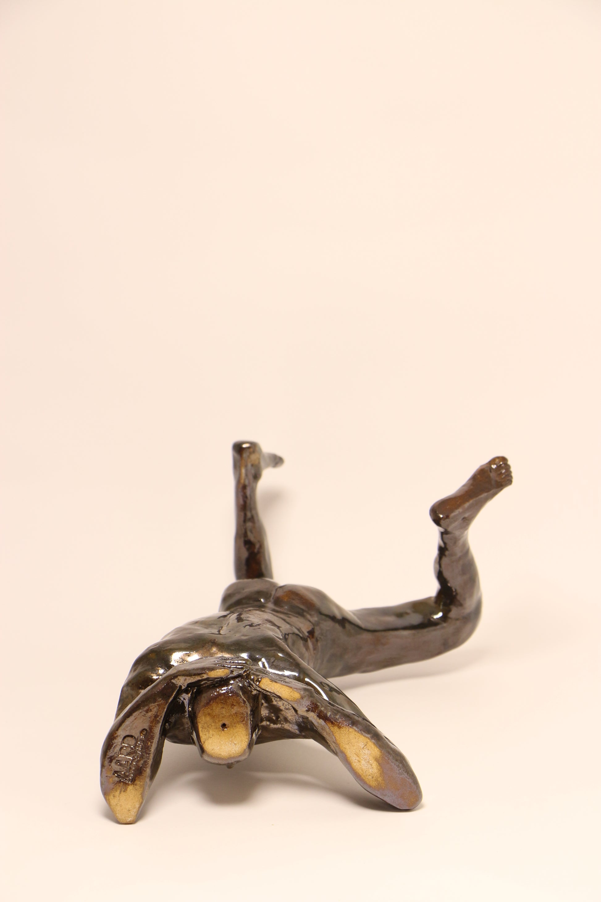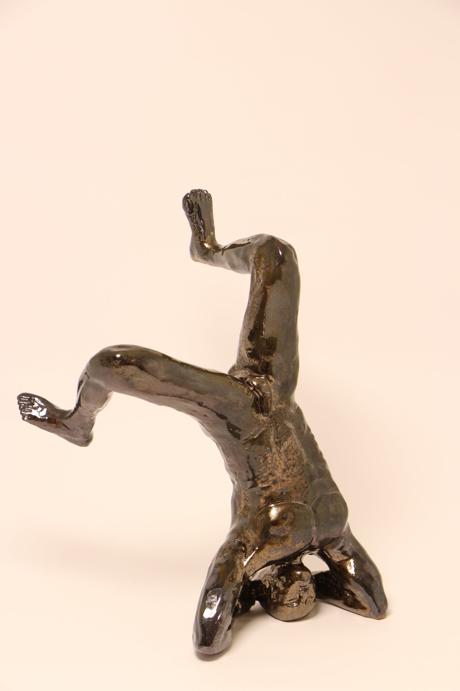 Bold, raw, and quietly triumphant, Nude Awakening captures a moment of suspended tension and grace - a nude male figure balanced in a forearm stand, the body both exposed and empowered. Hand-sculpted in stoneware and finished in a deep, smoky lustre, the surface reveals a subtle metallic sheen that shifts with light.