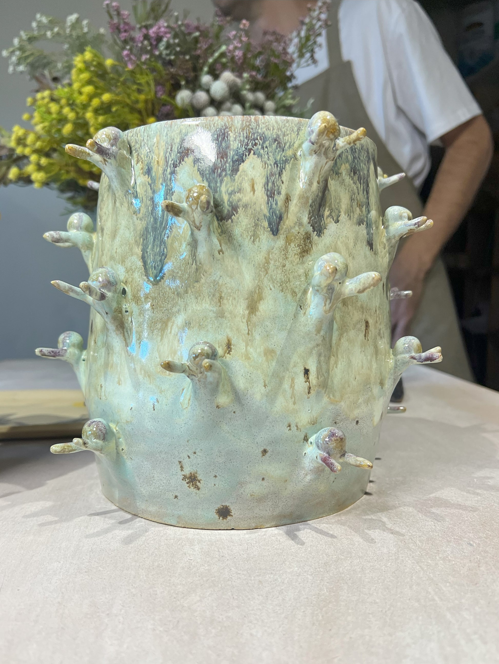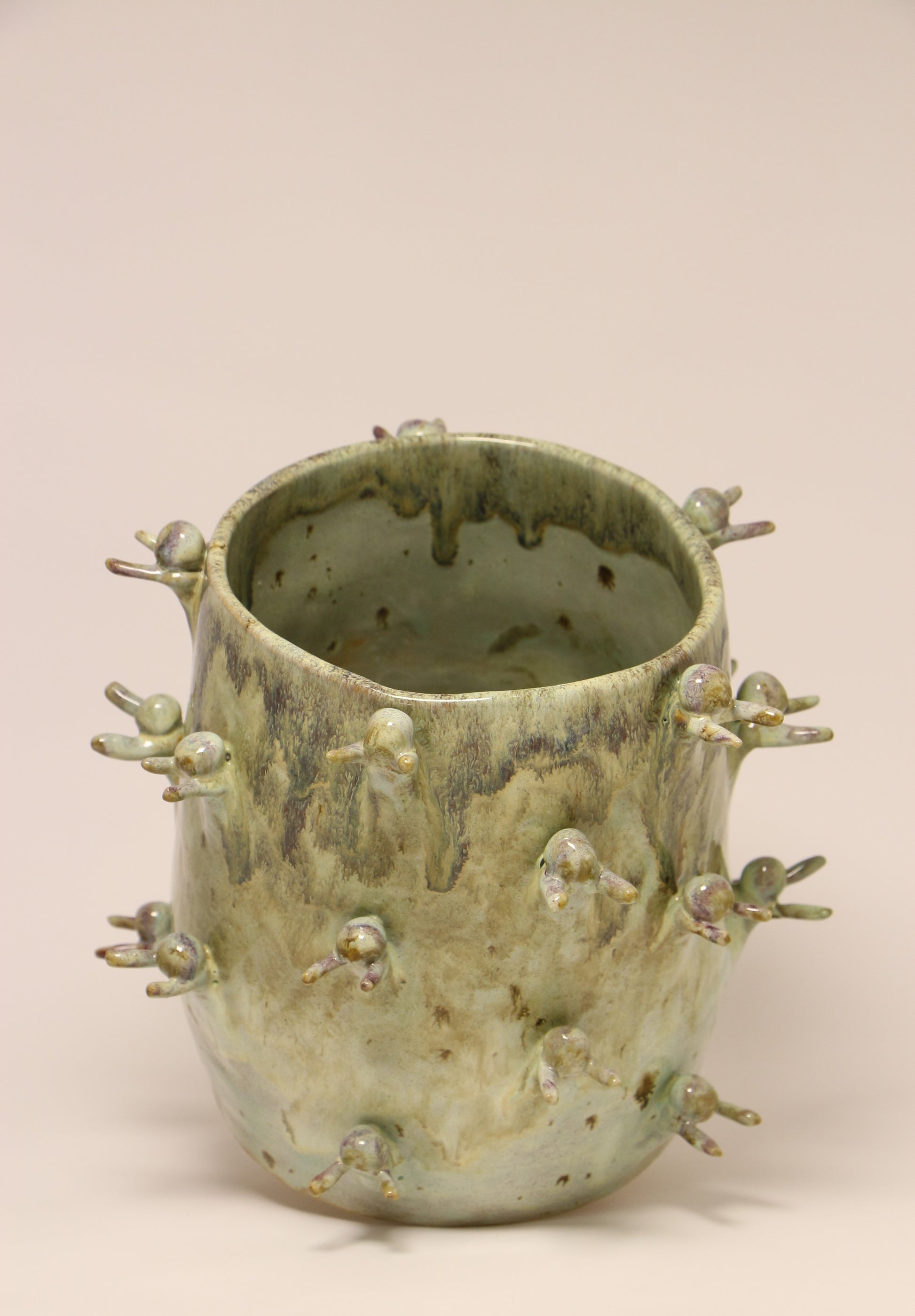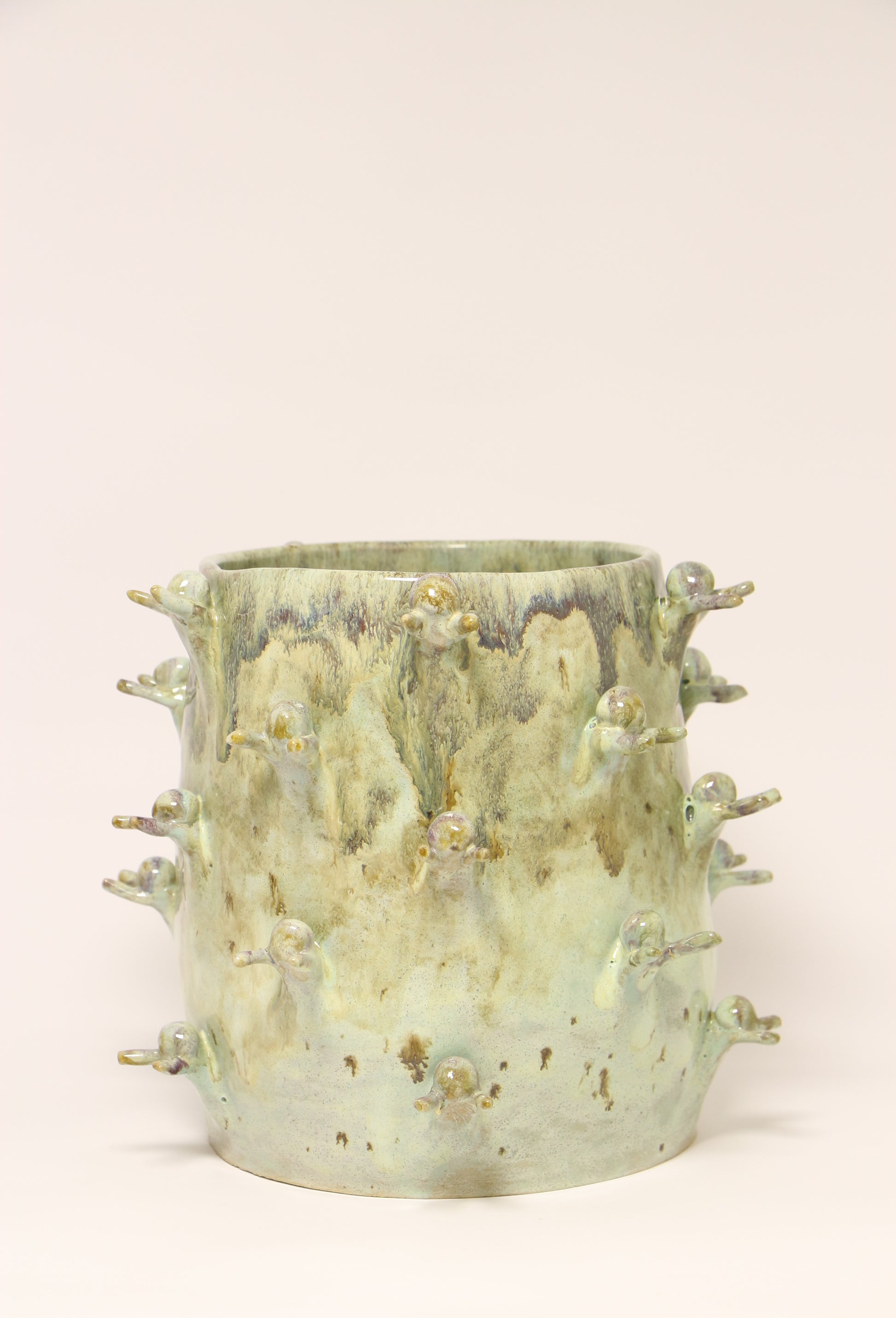Glazed in a soft, shifting palette of greens and pale yellows, the surface evokes thawing ground, spring light, and new breath. Though modest in scale, Unstuck carries a quiet intensity, offering functional use or simply standing as a sculptural meditation on change.